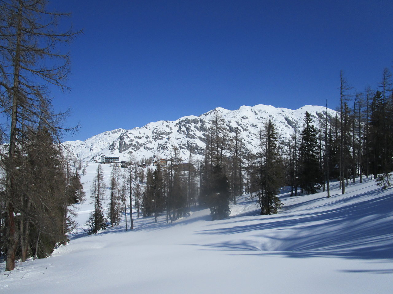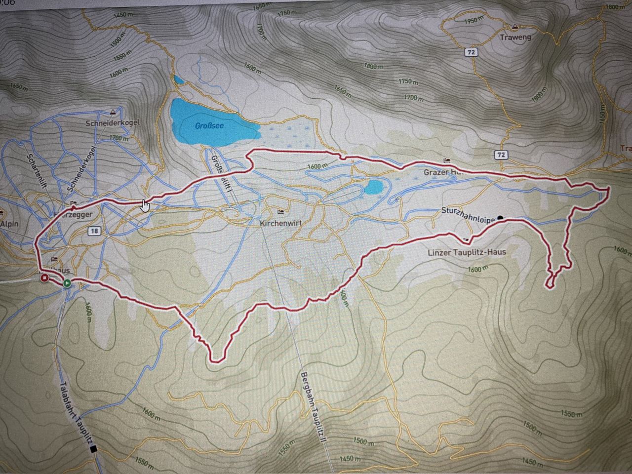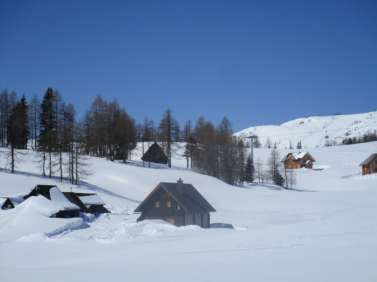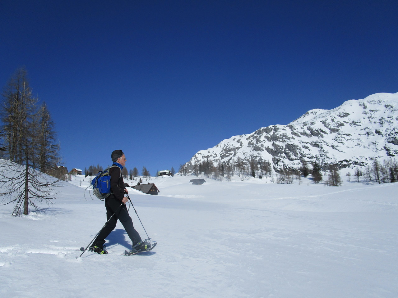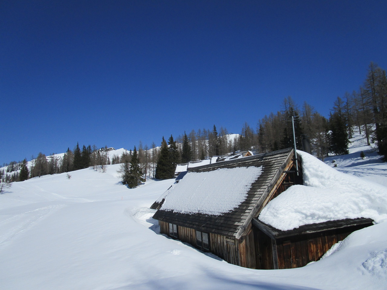 Nachdem es am Donnerstag schon auf der Postalm mit den Tourenschi so schön war, kam es am Freitag auf der Tauplitz mit den Schneeschuhen fast noch besser. Schon der Blick auf das Bergpanorama des Dachsteinmassivs und der Tauern bei der Auffahrt auf der Alpenstrasse war phänomenal. Willi und seine Frau Christl waren meine Begleiter und nach wenigen Metern am Rand der Langlaufloipe sind wir in den Tiefschnee abgebogen und zur Hochklamm leicht hochgestiegen. Bald ging es unter dem Sessellift durch mit wunderbarem Blick auf die Almgebäude, der Traweng im Hintergrund. Weiter ging es Richtung Osten, vorbei am Linzer Tauplitzhaus und weiter über die Hallschachen Richtung Steirerseehütten. Wir sind dann aber vorbei an der Grazer Hütte zum noch tief unter Schnee liegenden Großsee hinunter und von dort dann zu den Talstationen der Lifte Schneiderkogel und Lawinenstein hinaufgestapft. Auf den von der Sonne gut gewärmten Stufen des natürlich geschlossenen Hotels Hierzegger haben wir dann unsere Mittagsrast gemacht und haben dann entschieden, auf den Aufstieg zum Kriemandl zu verzichten. Nach dem kurzen aber steilen Aufstieg zum Hollhaus ging es wieder zum Auto und bei der Fahrt hinunter haben wir nochmals das Bergpanorama bewundert,
