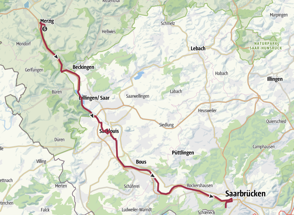 So schnell vergeht doch die Zeit, heute war schon wieder die letzte Tour am Programm und zwar entlang der Saar flußabwärts nach Merzig. Da aber die 12 km Teilstrecke bis Völklingen schon bei der Tour nach Emmersweiler zu fahren war, habe ich die Route in die Gegenrichtung gewählt, da schaut’s dann doch a bisserl anders aus. Ich bin also mit dem Rad zum Hbf Saarbrücken gefahren, dort den Zug nach Merzig genommen und dort ausgestiegen. Ich bin dann dem Track gefolgt, den mir mein digitaler Gehilfe Komoot vorgeschlagen hat, aber habe irgendwann gemerkt, dass das nicht die beste Route sein kann, ich war offenbar am falschen Ufer der Saar. Also habe ich in Beckingen nach 8 km abgebrochen und bin von dort erneut mit dem Zug nach Merzig gefahren. Jetzt aber richtig, Richtung Stadtzentrum, bei der Brücke über die Saar, ab da ist auch der Saarradweg schön beschildert und drüber ging es runter zum Ufer. Was folgte war wieder radeln vom Feinsten: Bretteleben, nicht zu heiß und nicht zu kalt, auch heute wieder trocken und so ging es erst einmal bis Saarlouis, wo ich schon vor ca. 40 Jahren bei der Hochzeit eines Freundes einmal war, der ein Mädchen aus Saarlouis geheiratet hatte. Nach einem kurzem Aufenthalt ging es wieder zurück zum Saarufer und weiter, vorbei an der Völklinger Hütte, zum feinen Hotel nach Saarbrücken.