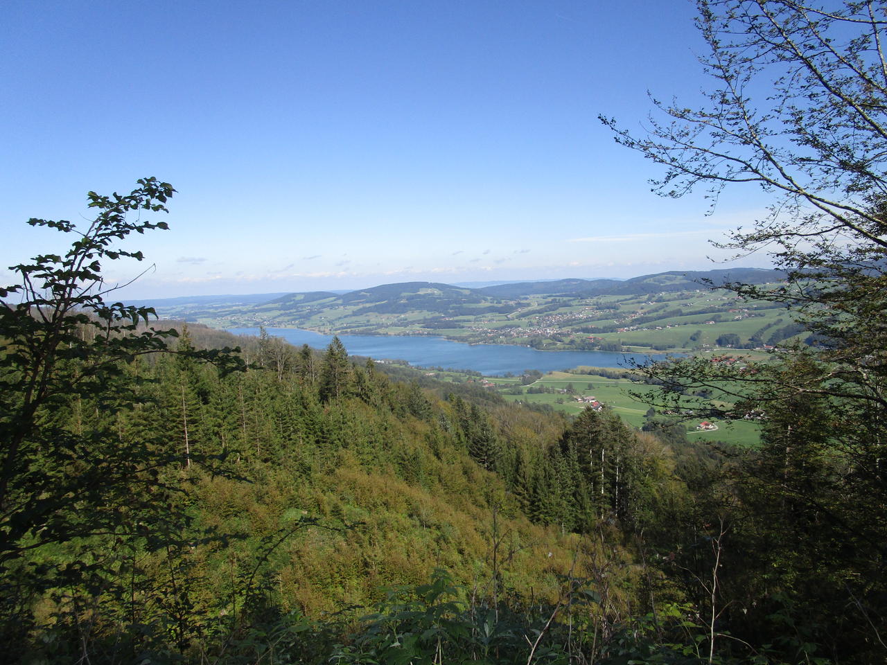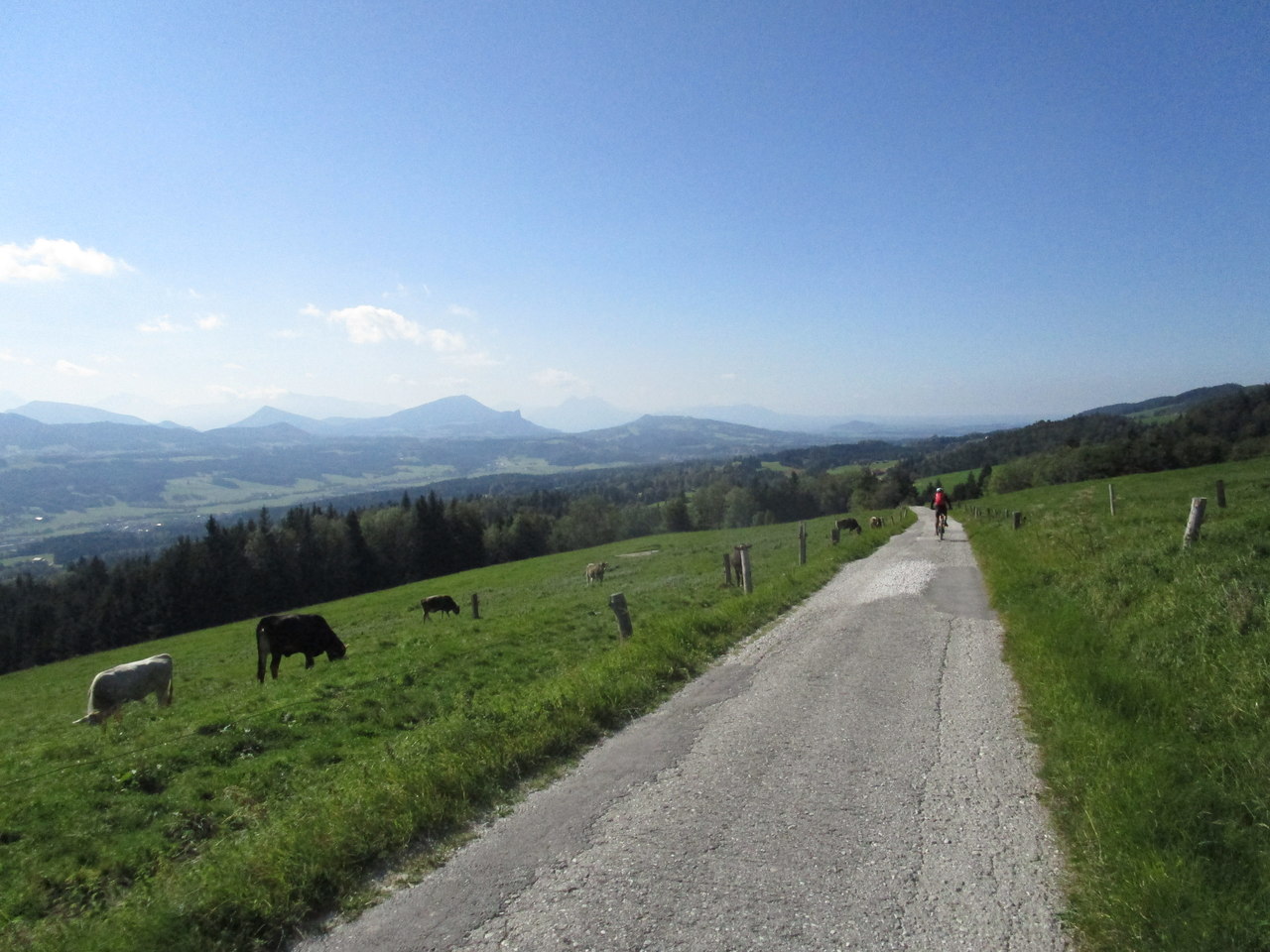 Bei traumhaftem Radlwetter haben mein Maturakollege Toni und ich die erste Etappe von Mondsee nach Fuschl in Angriff genommen. Die Räder auf den Träger, mit dem Auto bis Mondsee, dort die Räder versperrt deponiert und dann mit dem Auto weiter nach Fuschl. Von dort mit dem Postbus wieder zurück nach Mondsee zu unseren Rädern. Dort hatten sich die morgendlichen Wolken bereits verzogen, sodass wir auf kurze Hosen umrüsteten und losstarteten. Bald lag der Mondsee tief unter uns und es ging durch das wunderschöne Hochmoorgebiet, am Saurüssel vorbei Richtung Glashüttenwald und von dort runter nach Angern. Über Jagdhub vorbei am Schoibernberg nach Oberhofen am Irrsee und von dort hinauf zur Ruine Wildeneck und entlang der Ostflanke des Kolomansberg, bis wir aus dem Wald heraus hinüber zum Schober und hinunter nach Thalgau blicken. Jetzt geht es rasant hinunter nach Thalgau. Von dort zuerst am Radweg R 2 ein Stück nach Westen bis Unterdorf und dann nach Süden wieder bergauf und schließlich nach Osten über Mühlgrub und Achleiten bis in die kleine Ortschaft Hundsmarkt. Jetzt geht es wieder bergauf bis zur Verbindungsstraße Thalgau-Fuschl. Auf den letzten 4 km gibt es noch eine letzte Steigung zu überwinden, bis der türkisblaue Fuschlsee vor uns auftaucht. Nach ca. 66 km und mehr als 1.400 hm hat mein Akku noch einen Balken, Restreichweite angeblich noch 5 km – ein wunderschöner Biketag im Salzkammergut für uns beide.