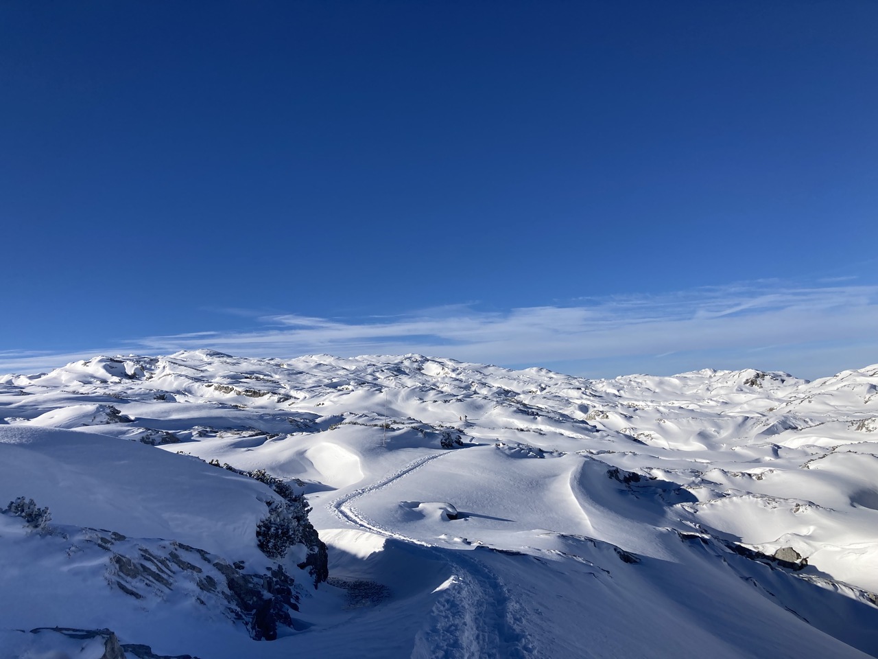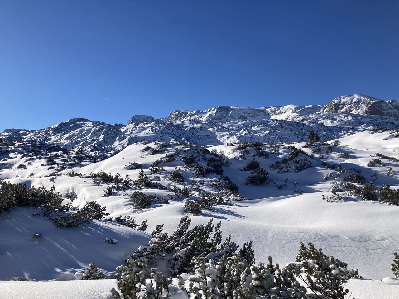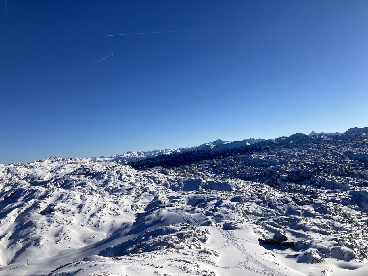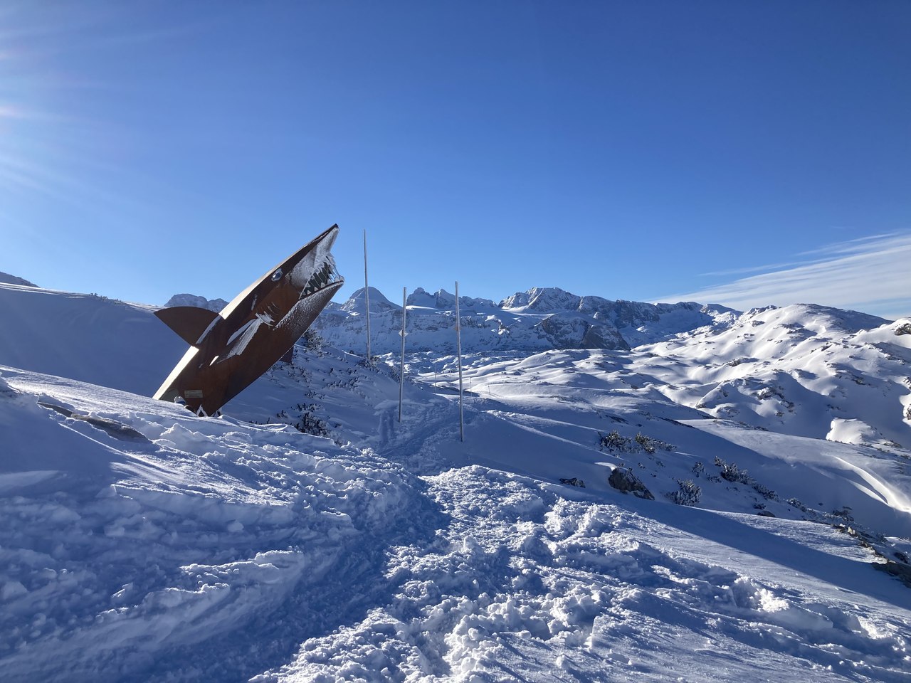 Weiter ging es dann von der Seilbahnstation 3 (Gjaid, 1.788 m) am bereits gespurten Weg zum Heilbronner Kreuz durch eine mystische Winterlandschaft bei strahlend blauem Himmel. Leicht ansteigend erreicht man dieses nach ca. 90 min, eine kurze Rast auf nunmehr 1.959 m, bevor es weiter hinauf geht zum Krippenstein auf 2.100 m. Beim Dachsteinhai genießt man erstmal dem Blick zum Hohen Dachstein und der Hagan-Lodge neben der Bergstation der Seilbahn und nur die letzten Meter muss man sich mit den hektischen Ski- und Boardfahrern teilen, die die 12 km lange Abfahrt in Angriff nehmen und kaum Zeit für die schöne Natur aufbringen können, denn sonst ginge sich vielleicht eine Abfahrt weniger aus.