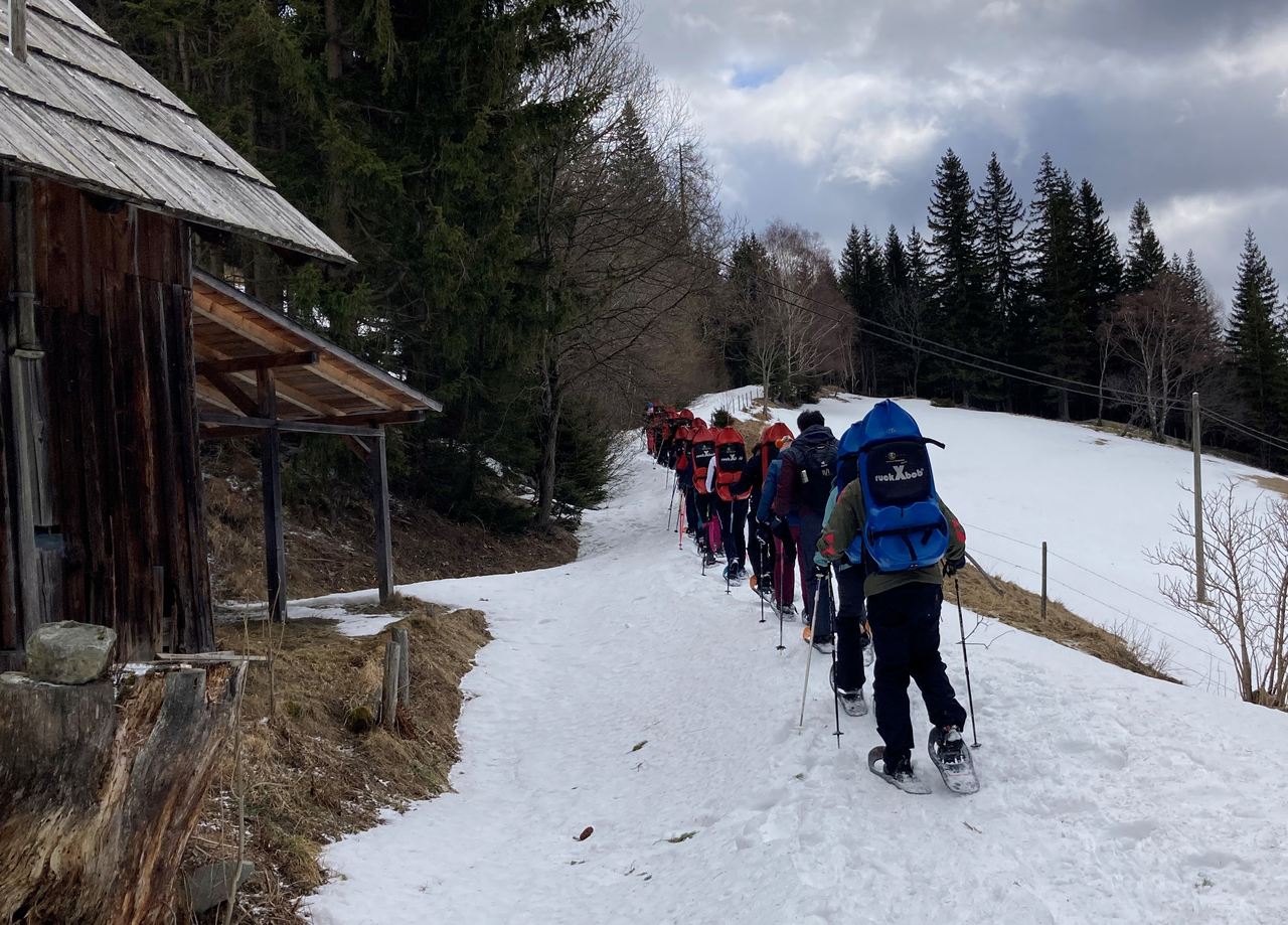Gestern hat mich ein Auftrag von Manfred Angerers Abenteuer Management ins Gebiet der Rax geführt. Vom Preiner Gschaid, am Grenzübergang Steiermark – Niederösterreich war beim Parkplatz vor der (im Winter leider geschlossenen) Edelweißhütte Ausgangspunkt hinauf zum Waxriegelhaus (1.361 m). Da der Parkplatz bereits auf 1.070 m liegt, waren also nur knapp 300 hm zu überwinden, und da es fast ausschließlich auf einer verschneiten Forststraße aufwärts ging, war es eher eine gemächliche Tour mit den 21 Schneeschuhwanderern. Gott sei Dank war ich nicht alleine, für diese große Gruppe hatte Manfred einen 2. Guide engagiert und Moni, eine Outdoorpädagogin und Pferdepflegerin, kannte diese Tour bereits sehr gut.