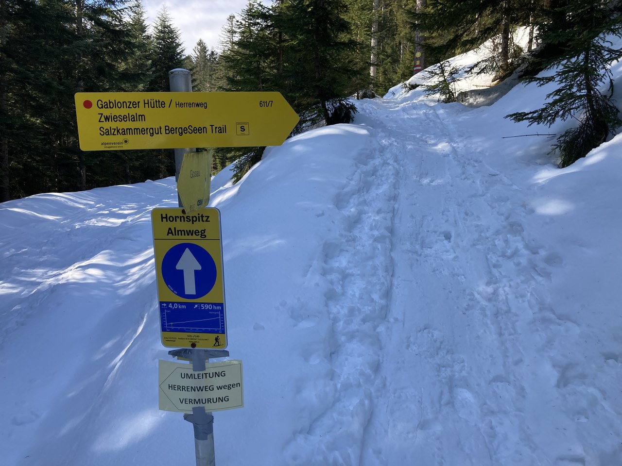 Es ist ja schon mehr als ein Jahr her, dass ich mit meinem Freund Willi die 11. Etappe des Salzkammergut BergeSeenTrails gegangen bin und damals war Sommer. Nach dem Abstieg von der Goiserer Hütte nach Gosau führte uns ein wunderschöner Wanderweg von der Gosauer Kalvarienbergkapelle zuerst zur Mittelstation des Hornspitzliftes und dann weiter hinauf bis zur Zwieselalm. Schon damals dachte ich mir, dass das auch ein sehr schöner Winterwanderweg mit den Schneeschuhen sein könnte und das wollte ich mir heute bestätigen.