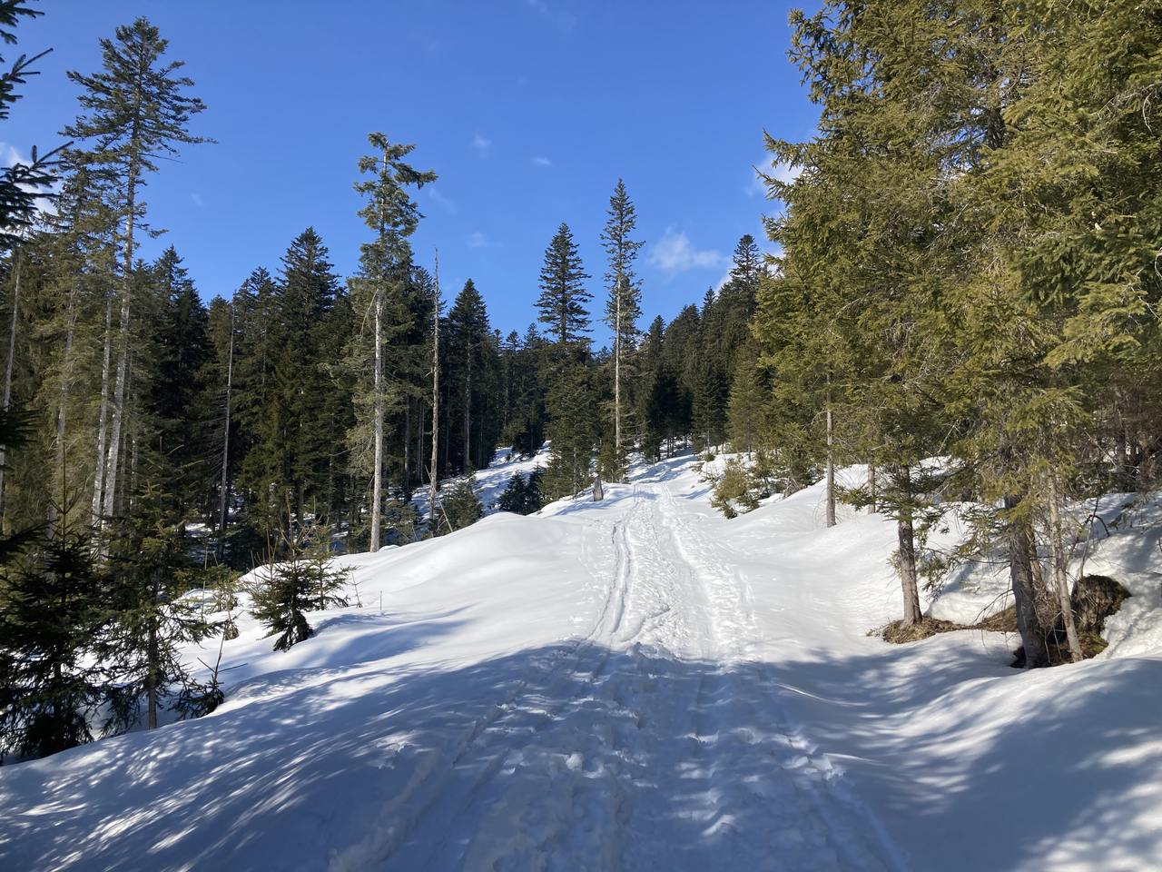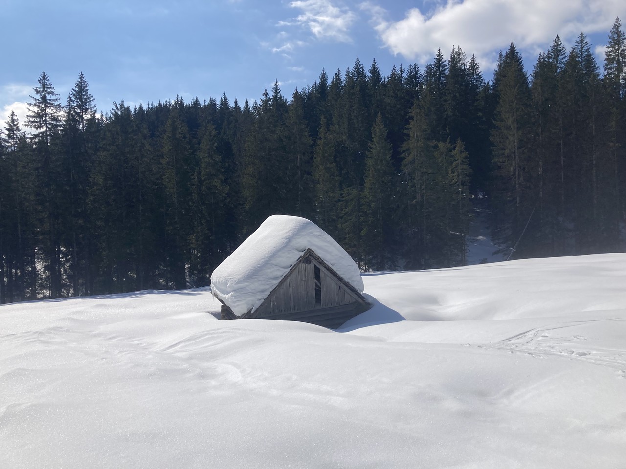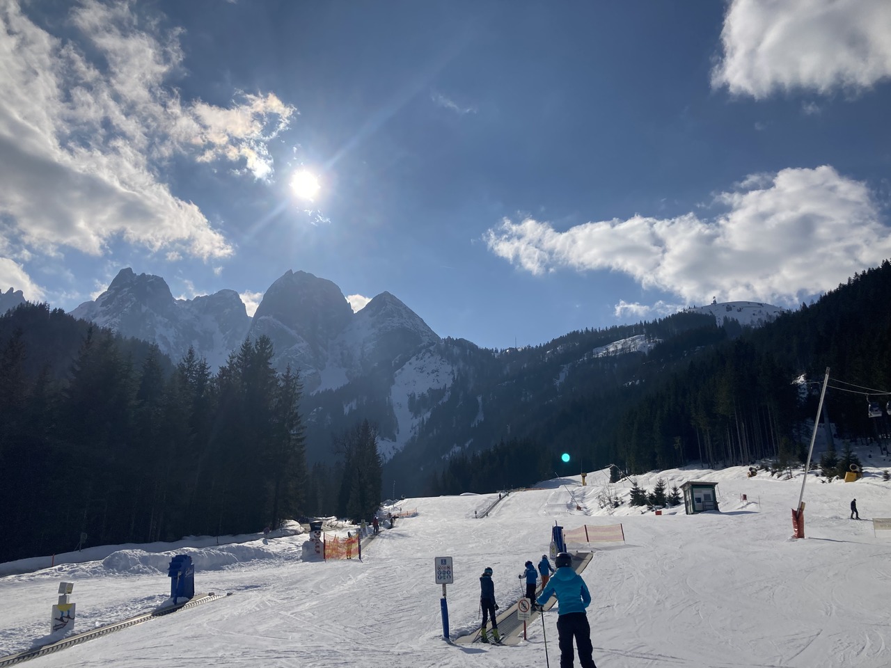 Angereist mit dem Öffi bis Gosau Wirtsstrasse war ich schon überrascht, wie viel Schnee dort auf gut 700 m liegt, es waren bestimmt noch gut 60 cm, die da noch auf den Hausdächern lagen. Und ab der Kalvarienbergkapelle ging dann der sogenannte „Herrenweg“ los Richtung Süden. Anfangs etwas steiler, aber bald ging es gemächlich weiter nach oben, vorbei an der Mittelstation des Hornspitzliftes, wo noch die Schifahrer vorbeizischten, dann Falmbergalm und unterhalb der Ötscheralm bis zum Schlepplift #9 Heute bin ich nicht bis ganz hinauf zur Bergstation der Panorama-Jet-Gondelbahn, sondern über die Piste hinab zur Talstation, um den geplanten Bus rechtzeitig zu erwischen, aber eigentlich schade – lohnender wäre gewesen noch die ca. 250 Höhenmeter weiter bis zur Sonnenalm hinaufzusteigen und mit der Gondelbahn hinunter zu fahren, denn der Abstieg am Rand der Piste ist dann doch nicht so ein tolles Erlebnis. Hier noch ein paar Eindrücke: