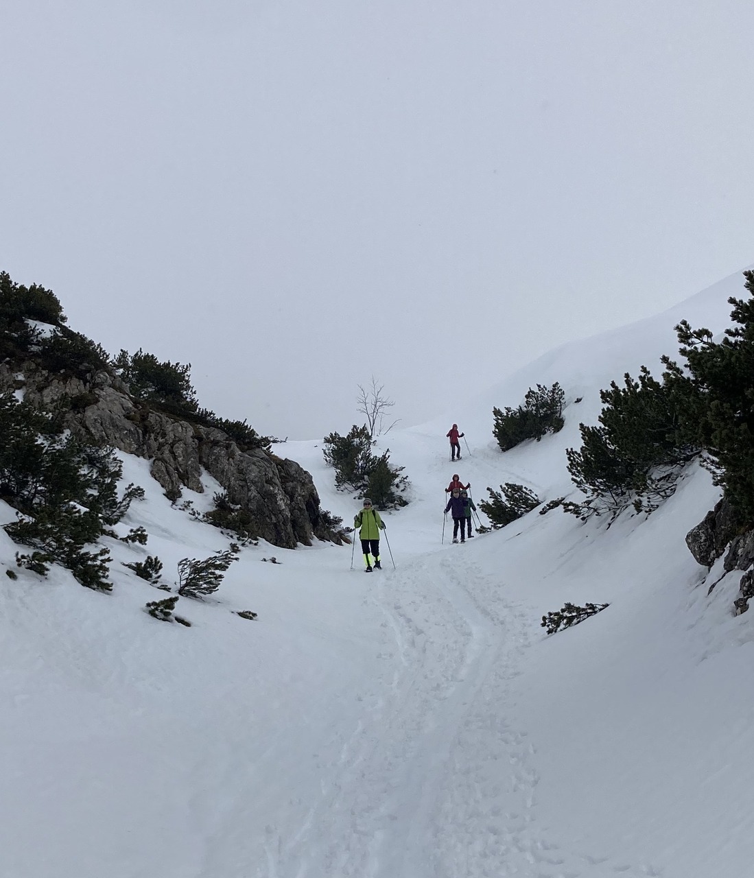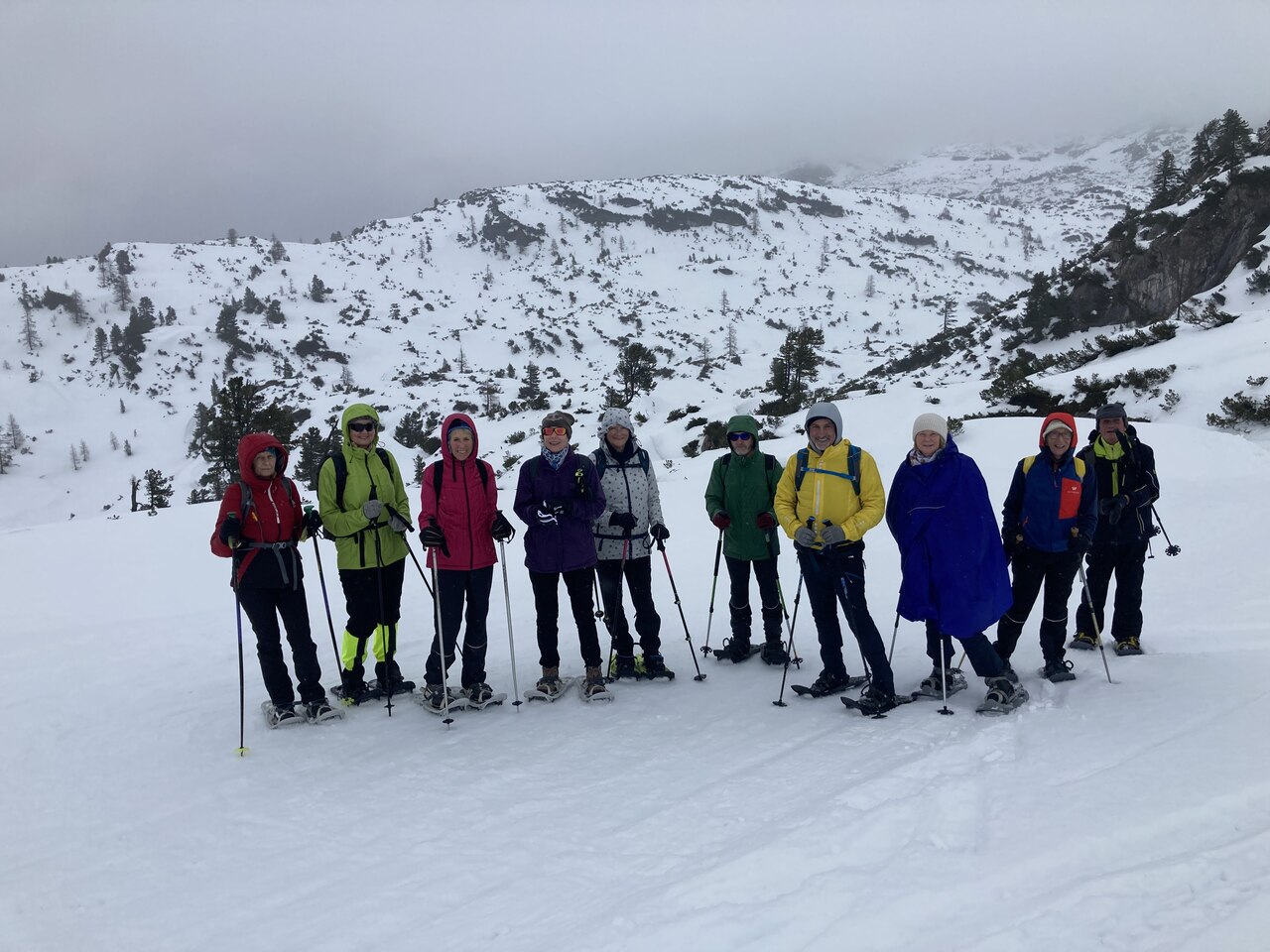 Die heutige Busreise vom Reisebüro Kastler zu einer Schneeschuhwanderung am Krippenstein, die ich als Guide begleiten durfte, war trotz ziemlich schlechtem Wetter für die Teilnehmer durchaus ein tolles Erlebnis. Gestern noch wunderschön, auch für morgen ist wieder halbwegs trockenes Wetter angesagt, nur heute hat es leider den ganzen Tag geregnet, sogar bis auf 2.100 m, wo ich so gegen 10:00 Uhr bei der Bergstation der Krippensteinseilbahn mit 10 Teilnehmern aufgebrochen bin. Aufgrund der schlechten Sicht habe ich den Plan, zum Heilbronner Kreuz zu gehen, gleich fallen gelassen und wir sind erst mal über die Schiabfahrt zur Gjaidalm gegangen, einer der Teilnehmer übrigens zum ersten mal auf Schneeschuhen unterwegs. Dort habe ich dann aufgrund des Regens angeboten, dass wer will, auch schon abbrechen und einkehren könne, aber nein, alle waren voll motiviert, noch eine Stunde Richtung Wiesberghaus weiter zu gehen und da auch alle zufriedenstellend ausgerüstet waren, war die Stimmung gut. Erst nach 13:00 sind wir dann – zurück bei der Gjaidalm – eingekehrt und die tollen und auch köstlichen Essensportionen genossen. Kurz nach14:00 sind wir dann noch die knapp 15 Minuten bis zur Seilbahn Station Gjaid raufgegangen und zum Krippenstein hoch und ins Tal abgefahren. Dort warteten wir bei einem guten Kaffee im Stüberl auf Harald, unseren Buschauffeur, der uns um 16:00 dort wieder abgeholt hat. Der war inzwischen mit weiteren 7 Gästen in Hallstatt und bei einer Kurzwanderung im Echerntal unterwegs.