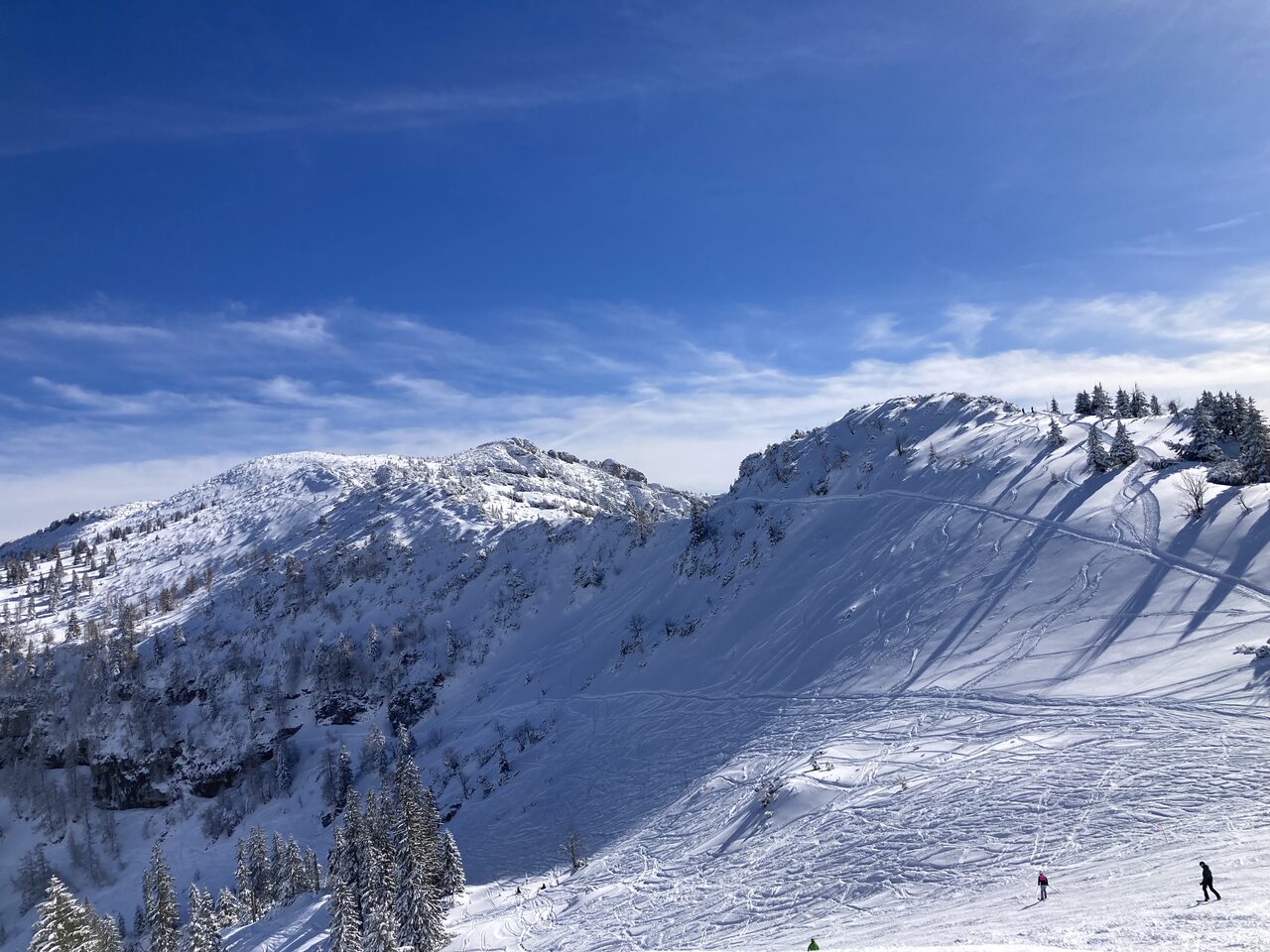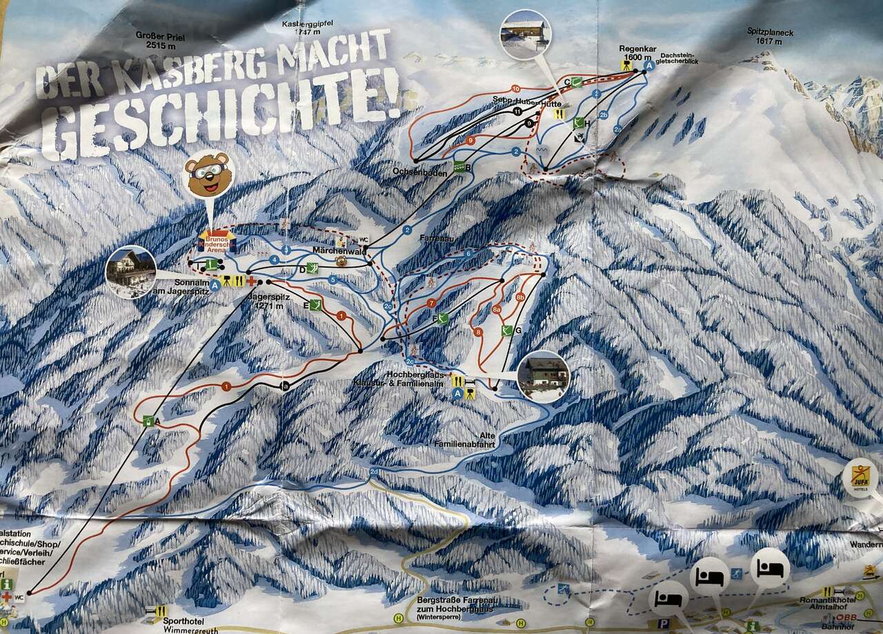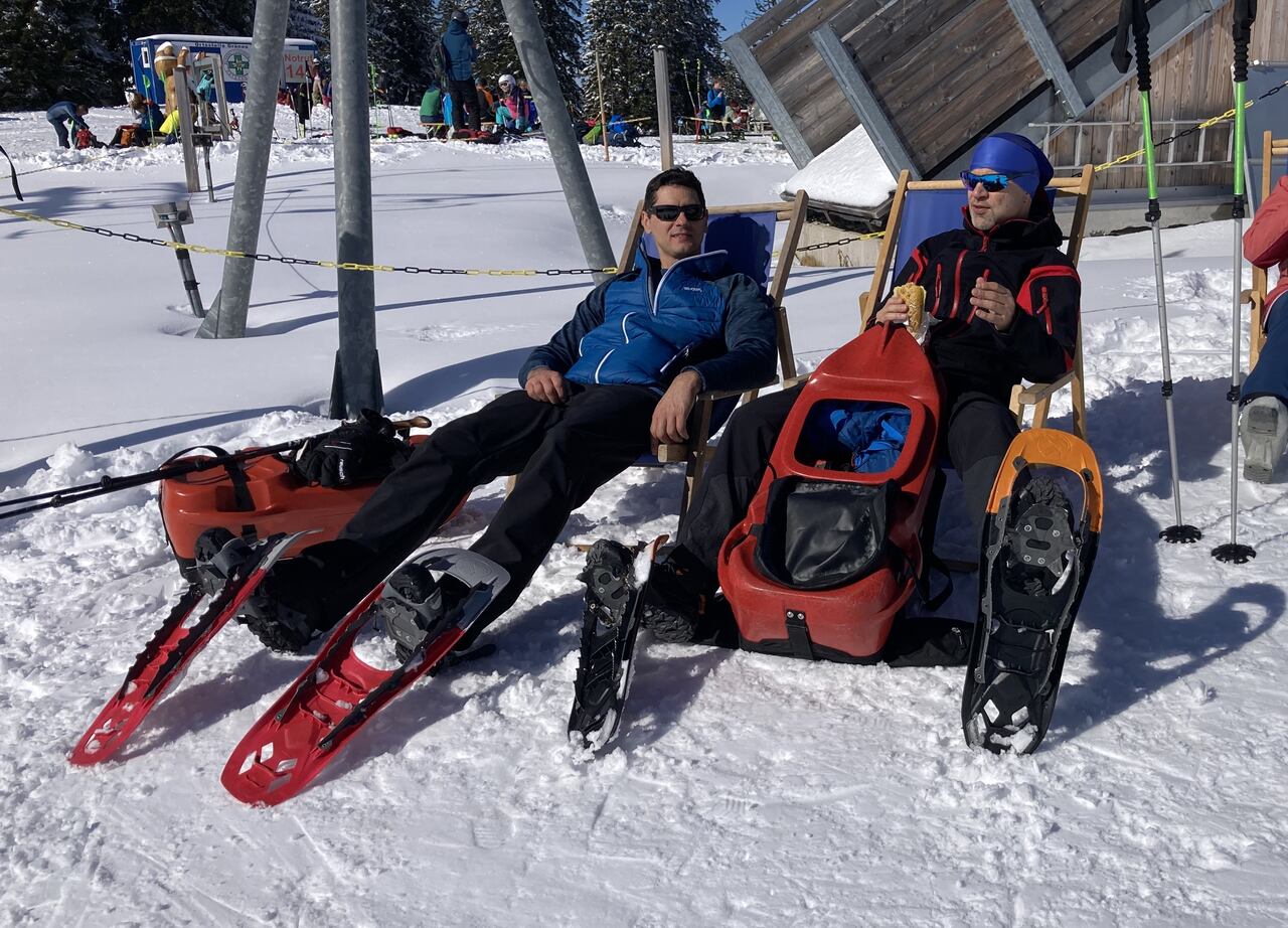 Unsere Gruppe war ja mit sogenannten „RuxxBobs“ unterwegs, das sind hohle Polyesterschlitten, in die man sein eigenes Gepäck reingeben kann und dann den Bob auf einem komfortablen Traggestell beim Schneeschuhwandern wie einen Rucksack am Rücken trägt. Das ist zwar ein klein wenig mühsam, aber dafür hat man dann bei der Abfahrt so richtig Spass. Aufgrund der mehr als mäßigen Schneeverhältnisse im unteren Bereich sind wir erstmals bis zur Sonnalm mit der Gondel raufgefahren, dann die Schneeschuhe an die Füße und den RuxxBob auf den Rücken und durch den Wald zur Talstation der 12er-Umlaufbahn. Mit dieser rauf zur Sepp Huber Hütte und dann wurde es sportlich. Durch den Tiefschnee im Wald und ein wenig am Pistenrand rauf zur Bergstation Regenkar, eine erste Rast, die manche schon im Liegestuhl genossen, dann weiter zum Aussichtspunkt „Dachsteingletscherblick“ und dann schneidig durch den Tiefschnee im Gelände runter Richtung KasbergSee und wieder zur Sepp Huber Hütte. Weil wie ja Spaß haben wollten sind wir nochmal rauf zum Regenkar und dort wurde dann geswitched – RuxxBob auspacken, Schneeschuhe und Stöcke aufs Traggestell und los geht die Abfahrt. Über die Schiabfahrt runter zur Farrenau und dort entschied ich mich entgegen dem ursprünglichen Plan, doch mit den Bobs auf der alten Familienabfahrt bis ins Tal abzufahren und nicht die Gondel zu nehmen. Das bedeutete zwar ca. 1,2 km den Schlitten bis zum Hochberghaus teilweise zu ziehen, aber dafür hofften wir auf weiteren Spaß. Leider war aber dann insbesondere auf der asphaltierten Hochbergstraße dann doch sehr wenig Schnee, um es richtig krachen zu lassen, dafür entschädigte der letzte Hang vor dem Parkplatz bei der Talstation nochmals richtig. Dort lag dann doch ausreichend Schnee um so richtig Tempo zu zeigen.