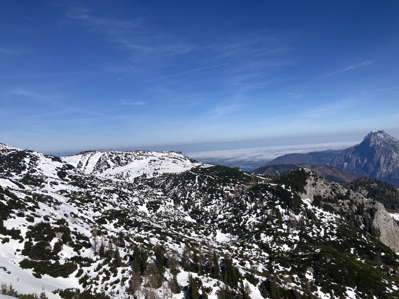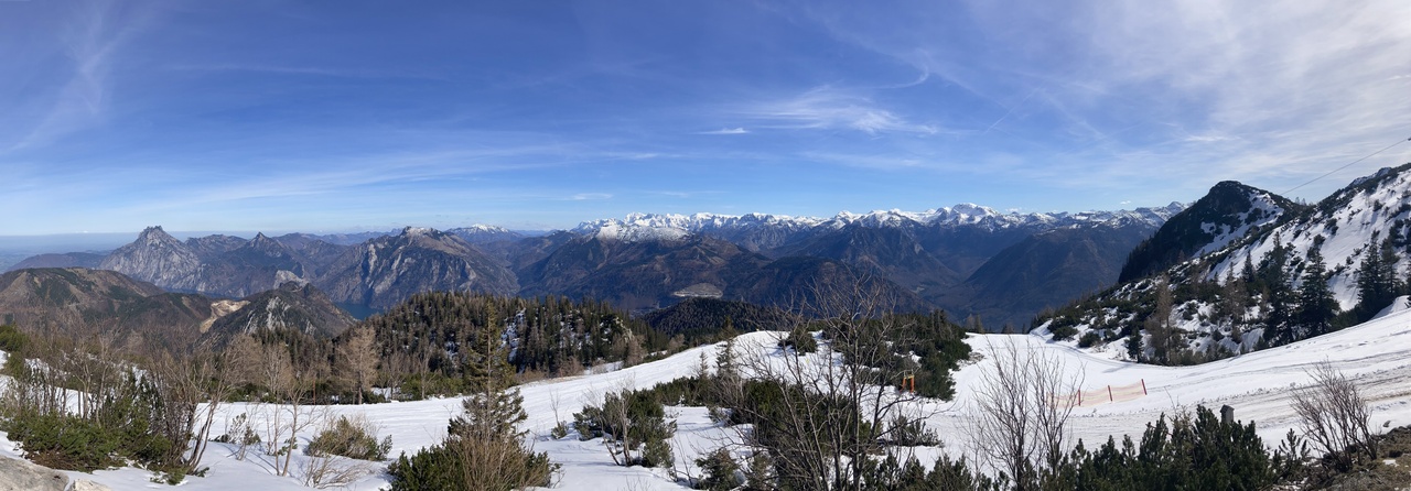 Die heutige Veranstaltung von Hans Prangl auf der sonnigen Terrasse der Kranabethhütte am Feuerkogel war mehr als gelungen. Am wahrscheinlich einzig schönen Tag dieser Woche durfte ich meine beiden netten Begleiterinnen bereits am Bahnhof in Ebensee Landungsplatz kennen lernen. wo uns Hans abholte und zur Talstation brachte. Elfi aus Linz und Anni aus Salzburg waren oben angekommen gleich von Beginn an begeistert – kein Wunder bei der traumhaften Aussicht auf den Dachsteingletscher und das Tote Gebirge. Da bede sehr sportlich waren, entschloss ich mich, mit ihnen die gr0ße Runde über Alberfeldkogel, hinteres Edeltal und Helmeskogel zu gehen (immerhin 7,1 km) und dann die Hütte anzusteuern.