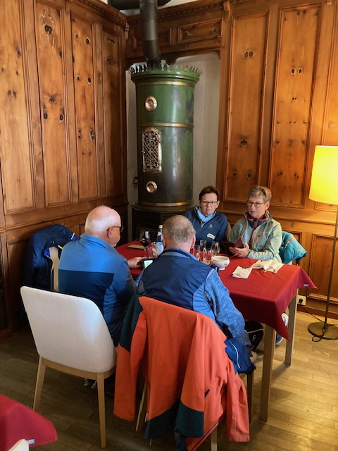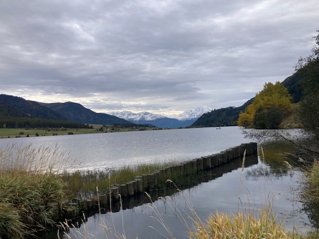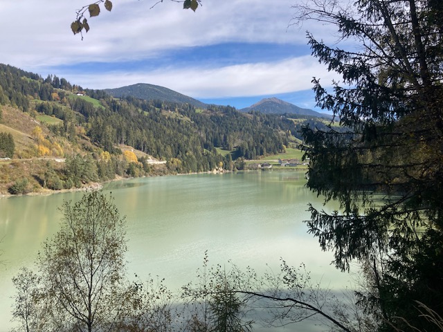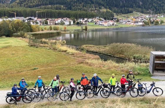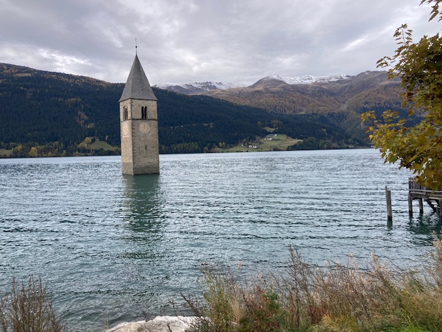 Am 2. Tag ging es dann mit dem Bus bis rauf zum Reschensee, eine ziemlich lange Fahrt, da die Apfelernte voll im Gange war und dementsprechend viele Traktoren mit ihren Anhängern unterwegs waren. So konnten wir dort erst um 11:00 Uhr starten und gleich mal staunend den im Stausee versunkenen Kirchturm von Altraun bewundern und dann ging es zum Teil richtig zünftig bergab durch den Vinschgau. Ein Mittagessen in einer sehr schönen Stube im GH Grüner Baum in Glurns war die einzig wirkliche Pause auf den 82 km, bis wir dann pünktlich um 17:00 in Meran die Räder wieder in den Bus verladen haben.