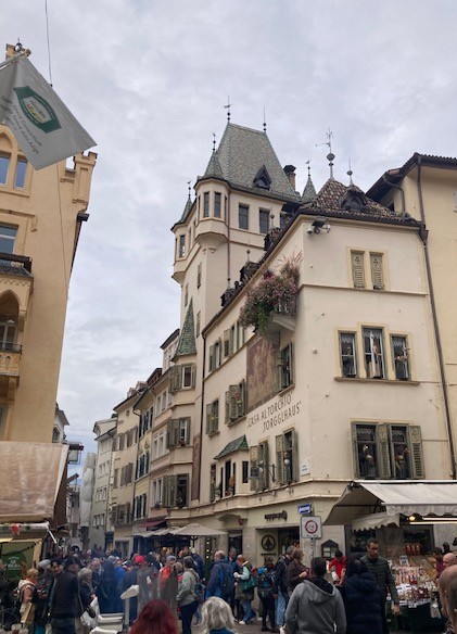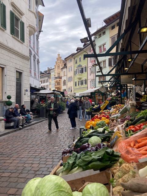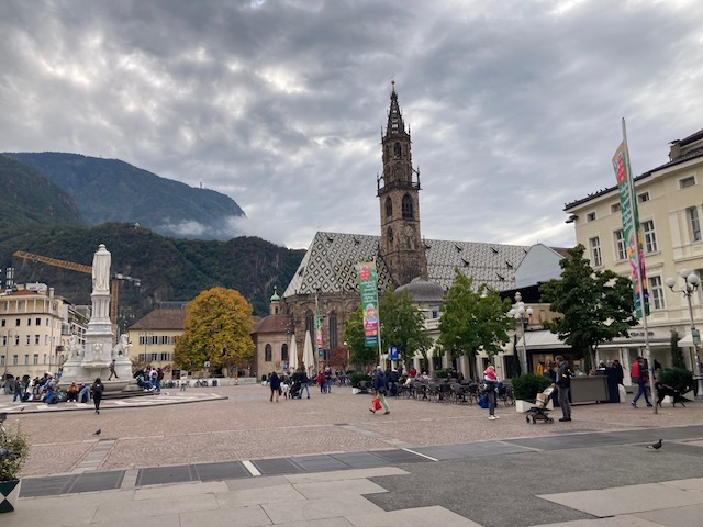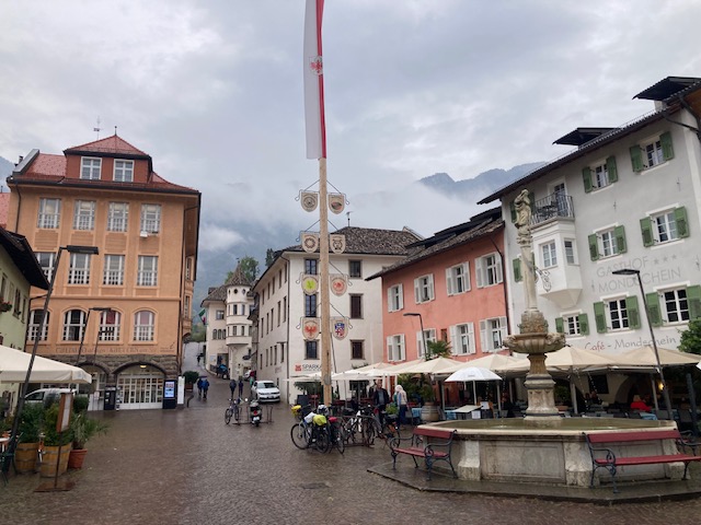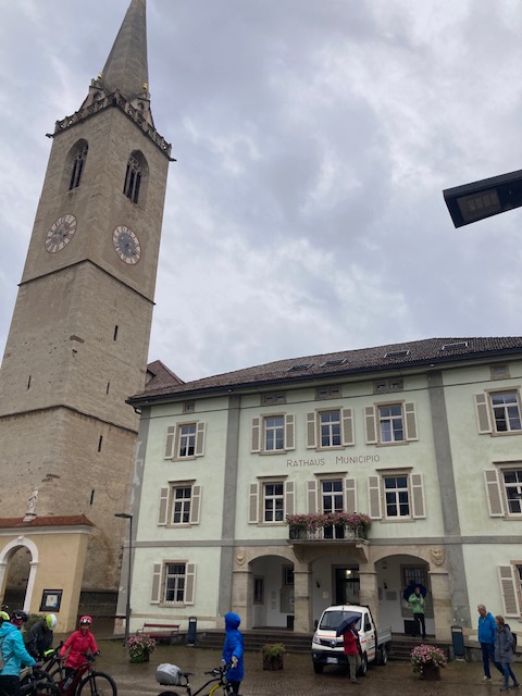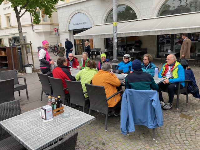 So lautet der Text des „Südtirolliedes“ und am 4. Tag unserer Tour hat das leider nicht so recht gestimmt. Am Weg vom Hotel in Brixen bis Bozen war es zwar sehr frisch aber noch trocken. In Bozen beeindruckten neben dem Dom die wunderschönen Laubengänge, die prächtigen Bürgerhäuser und das gemütliche Batzenhäusl, wo wir uns zum Mittagessen einfanden. Am Markt tummelten sich viele Leute, gerne wären wir noch länger dort geblieben, aber wir mussten weiter nach Kaltern. Von der Etsch weg ging es dann ziemlich bergauf nach Eppan und dort begann es erst zu nieseln und dann richtig zu regnen. Blöderweise hatte dann noch Rudi einen Platten, sodass wir dort dann noch den Schlauch des Hinterrades wechseln mussten. Wir erreichten dann Kaltern, einen Espresso oder Cappuccino unter den Sonnenschirmen, die die Plätze halbwegs trocken hielten und dann die letzten 15 km bis zum Kalterer See und schließlich Auer. Zu allem Unglück verloren wir dann bei einer sehr unübersichtlichen Kreuzung 2 Teilnehmer, die aber Gott sei Dank dann auf ihren eigenen Wegen den Treffpunkt mit dem Bus erreichten. Die Stimmung war dann im Bus trotz des Wetters aber gut und beim Abendessen tröstete uns das eine oder andere Glas Wein über den feuchten Tag hinweg.