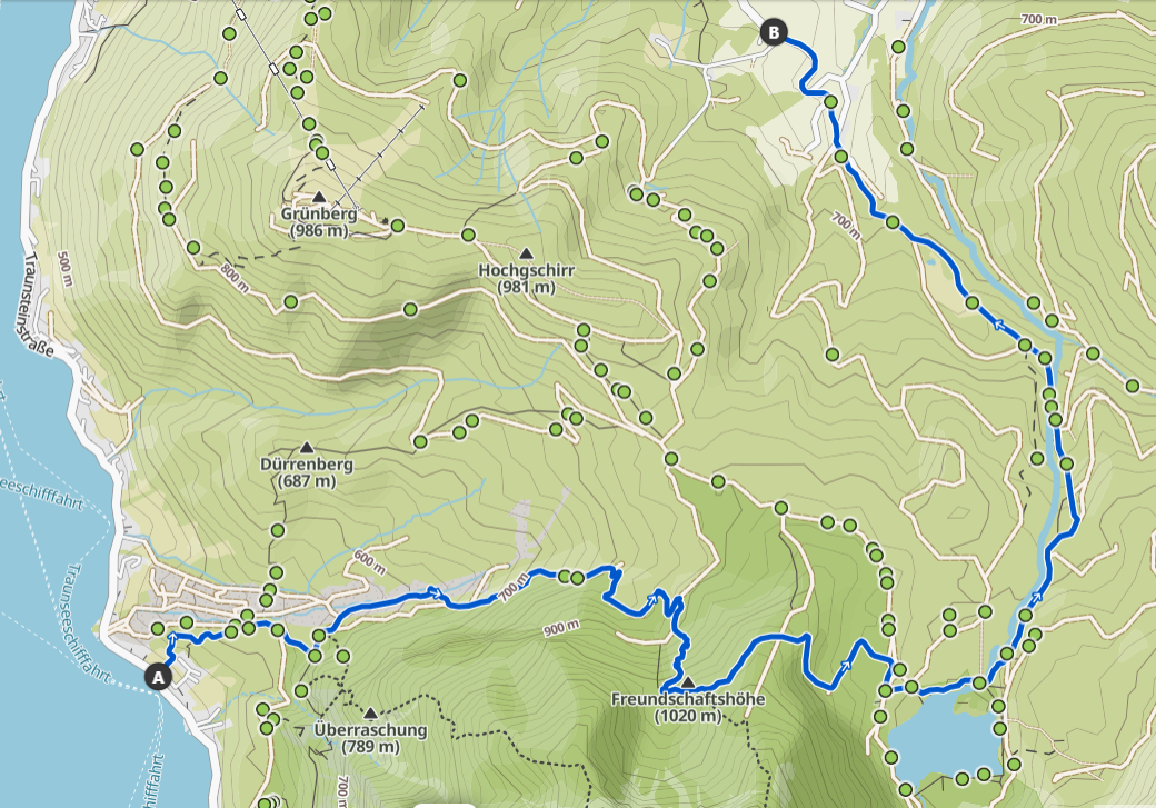 Am Bahnhof hebe ich ihn um 10:23 abgeholt, dann mit der Traunseetram zum Seebahnhof und weiter mit dem Salzkammergutshuttle-Taxi zum Hois’n. Über den Gschliefgraben sind wir dann hochgewandert, bis zur kaum erkennbaren Abzweigung von der Forstrasse rein ins steile Gelände. Von Steinmanderl zu Steinmanderl kämpften wir uns die steile Westflanke hoch, bis wir ziemlich verschwitzt oben auf 1.020 hm ankamen. Natürlich hatte ich auch ein kleines „Bier von hier“ in der Kühlbox mit hinaufgenommen, um auf unsere Freundschaft anzustoßen.