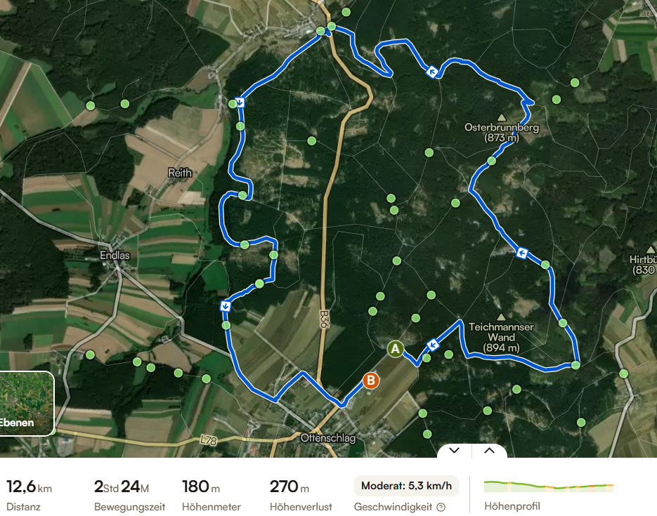Heute hat ja meine „Gesundheitsvorsorge aktiv“ im Lebens.Resort.Ottenschlag begonnen. In Ybbs von der A 1 abgefahren, in Persenbeug über die Donau und dann das Yspertal hoch Richtung Zwettl – eine sehr schöne hügelige und waldreiche Gegend. Das Einchecken in der Rehaklinik war problemlos, Mittagessen mit 3 Oberösterreichern am Tisch, die auch heute angereist sind und um 13:30 ein kurzer Eröffnungsvortrag. Da dann bis zum Abendessen um 17:30 nichts mehr am Programm stand, habe ich in Anbetracht des frühlingshaften Wetters gleich eine Wanderung geplant und fast 13 km eine schöne Runde nördlich von Ottenschlag gegangen. Fast immer im Wald auf Forststraßen und keine Menschenseele unterwegs. Nach dem Abendessen mit gebratenem Zander ging es zur Anfangsuntersuchung, der Arzt war sehr nett und auch zufrieden mit mir, bin schon gespannt, was er mir alles verordnet hat. Dann noch am Hauskanal des Fernsehers ein Video mit Hygieneschulung und der erste Tag ist geschafft.