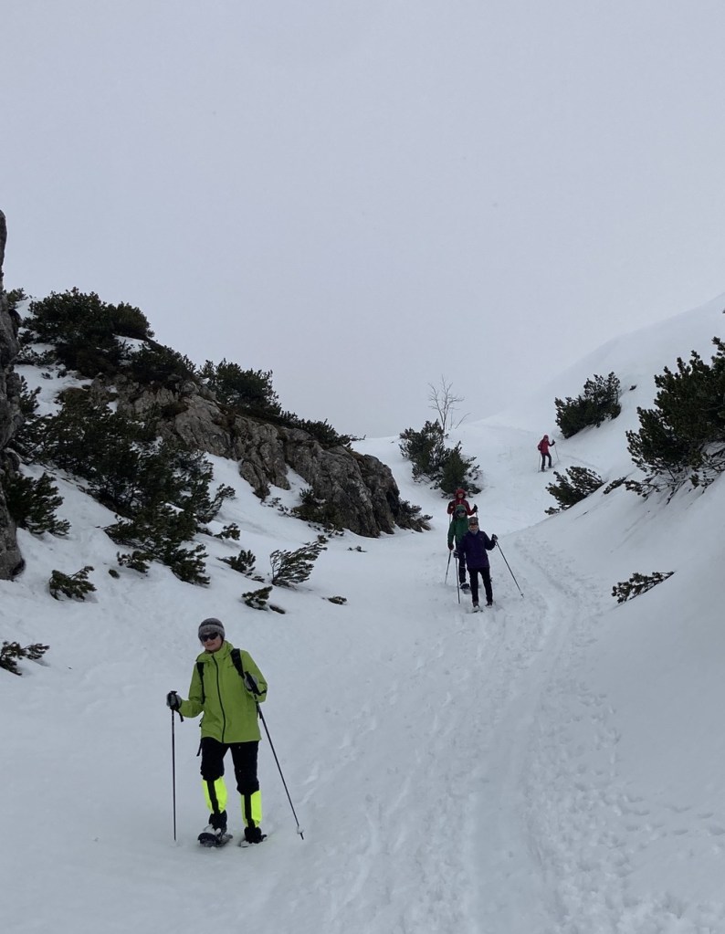 Generell ein paar Zeilen zum Schneeschuhwandern: Es ist für mich, der von sich behaupten kann ein gar nicht schlechter Schifahrer (auf Pisten und auch im Gelände) zu sein und auch beim Skaten mit Langlaufskiern Spass hat, eigentlich die wunderbarste Wintersportart. Man kann sich nach Lust und Laune fordern oder auch nicht, man kann die Natur ganz unmittelbar genießen, der Weg den man geht ist vorgespurt oder man kann auch daneben durch den tiefen Schnee stapfen, es ist minimal verletzungsanfällig und die Ausrüstung ist vergleichsweise günstig und sehr langlebig. Ich kann Euch nur sagen, ich liebe es und talwärts ist es für mich eine Riedengaudi. Und die unverspurten Tiefschneehänge mit aufgefirntem Schnee, von dem die Skitourengeher immer träumen, gibt es meist nur in schönen Fernsehbildern aber nicht in der Realität. Wer es noch nie probiert hat, sollte es unbedingt mal versuchen.