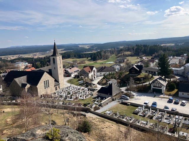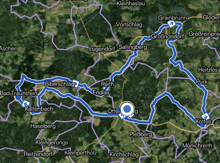 Die Tour hatte es aber in sich, bei gesamt 53,4 km Länge waren auch 770 hm zu bewältigen. Ja, das Waldviertel ist wie das Mühlviertel, es geht dauern bergauf oder bergab. Zu sehen gab es nichts besonderes nur der Wachtberg in Bad Traunstein (dort gibt es auch ein VIVEA-Hotel ähnlich wie in Bad Goisern) nach ca. 13 km ist eine wirkliche kleine Attraktion. Gleich hinter dem Friedhof steht dieser Granitblock und bietet eine wunderbare Aussicht, bei klarem Wetter bis Schneeberg und Ötscher. Im Mohndorf Armschlag kann man sich in etwa vorstellen, was sich dort im Sommer tut, dort dreht sich wirklich alles um den Mohn. Die Strecke selbst ist nicht wirklich attraktiv, man fährt immer auf Straßen, eigene Radwege gibt es nicht. Aber zumindest heute war der Autoverkehr mehr als überschaubar. Am Schluß nach dem Ort Kottes war ich dann doch schon so müde, dass ich beim Anstieg über 128 hm doch auch mal den Turbo als Unterstützung gewählt habe. Generell sind die Anstiege nicht besonders steil, sie ziehen sich aber ziemlich.