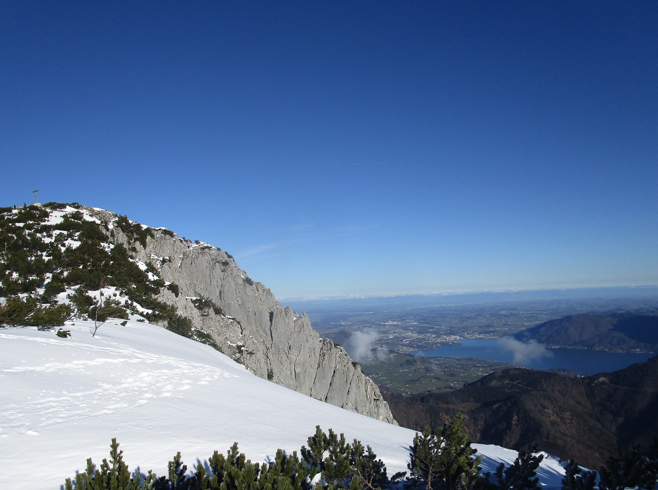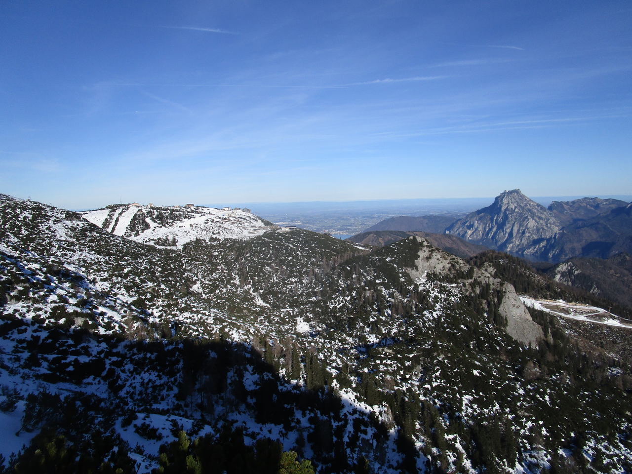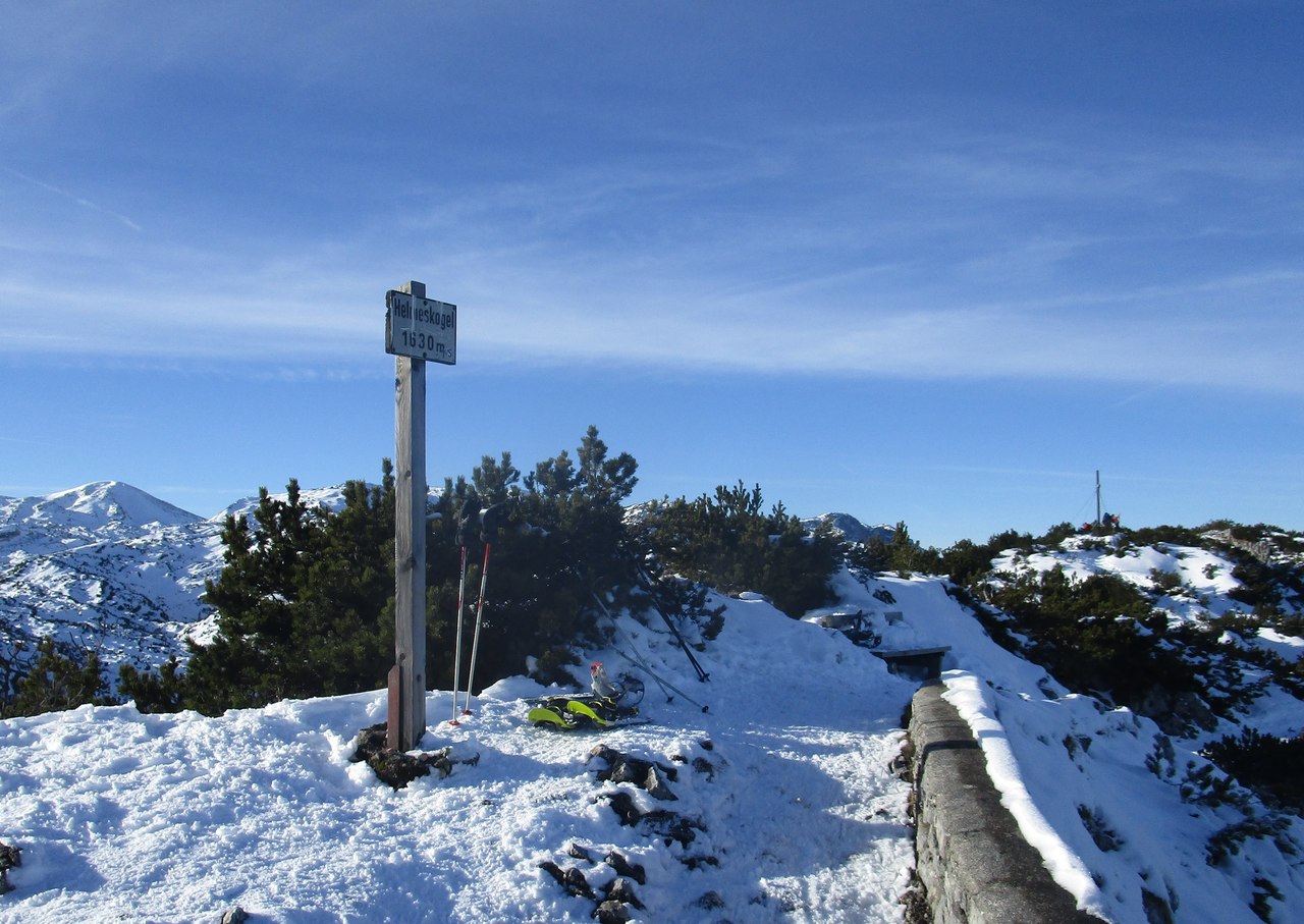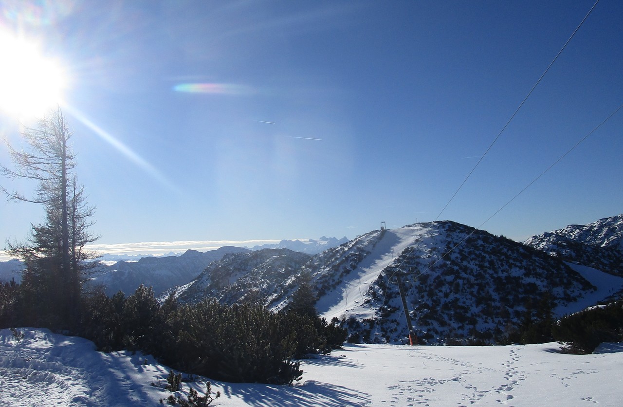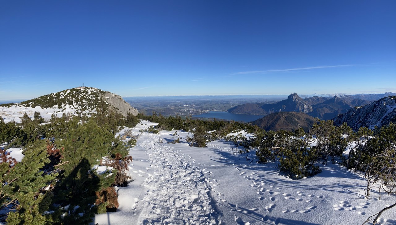 Ja, das war eine gute Entscheidung. Auch wenn sich niemand gefunden hat, der/die mich heute begleiten wollte/konnte, war es traumhaft dort oben wieder zu wandern. Klimafreundlich um 9:24 mit dem Zug nach Ebensee, die 1,5 km bis zur Talstation der Seilbahn sind mit guten Winterwanderschuhen nicht so schlimm, dann rauf und es war dann doch kurz vor dem Plateau etwas weiß. Gerade halt noch, denke ich mir, das wird was werden. Aber die Schneeschuhtrails 1 + 2 auf Alberkogel und Helmeskogel sind tadellos markiert und gespurt und deshalb problemlos zu gehen. Da für mich aber doch immer etwas Abenteuer dabei sein muss, bin ich vom Alberfeldkogel ins Edltal abgestiegen und habe mir von dort den Weg zum Trail 1 gesucht, der vom Feuerkogel zum Helmeskogel rüberführt. Eigentlich habe ich gedacht, dass es sicher ein paar andere „Narrische“ gibt, die bei so wenig Schnee den Weg durch die Latschen gesucht und auch gefunden haben, aber die Spuren, denen ich manchmal gefolgt bin, waren von Hasen oder Gämsen. Nichts desto trotz habe ich es schließlich geschafft, bin in den Trail eingemündet und noch zum Helmeskogel hochgegangen. Um 14:00 war ich wieder bei der Bergstation und um 16:00 schon wieder geduscht zu Hause.